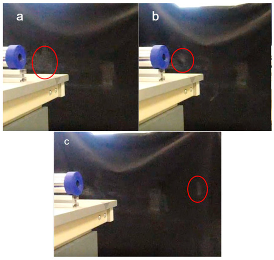 To implement fine-tuning of the aperture size and hitting force, two further experiments were undertaken. For the aperture size experiment, it showed that the 11 mm diameter aperture produced a cloud of fast-moving smoke. However, it was not a vortex ring and the cloud dissipated quickly. Next, the 23 mm aperture did not produce any vortex rings. There was fluid coming out from the aperture when the solenoid was activated; however, there was not enough energy to push it and keep the fluid moving forward. An aperture with a diameter of 17 mm was tested and a good result was found. For this aperture dimension, a visible smoke ring was produced, and it travelled a relatively long distance before it deformed. These results are presented in Figure 6.