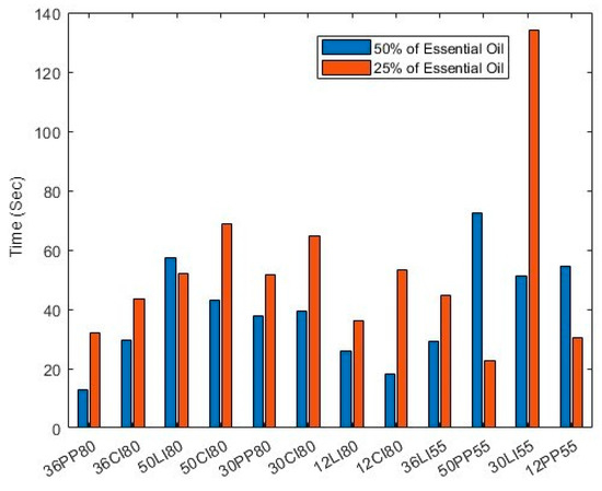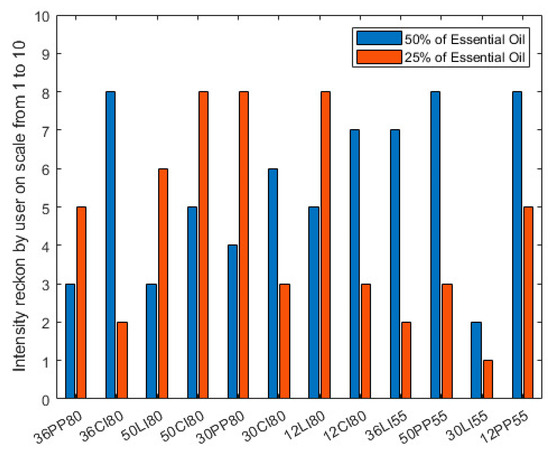 For calibration purposes, essential oil diluted with 25% ethanol had a VOC measurement of 37–42 KOhms reading (BME680, Bosch, Gerlingen, Germany) and 29–35 ppm reading (Tiger, Ion, Royston, UK), whilst essential oil diluted with 50% ethanol has a VOC measurement of 75–82 KOhms reading and 21–25 ppm reading. Note that the BME680 is a commercial general purpose VOC sensor based on an n-type metal oxide. It detects volatile organic compounds based on a change in resistance of the metal oxide. However, the result given is one resistance value which represents an overall VOC content [19]. Therefore, it is likely that the concentration measurement comprises both the ethanol and the essential oil. However, ethanol has a very high odour detection threshold and is likely to be almost odourless to the user.
