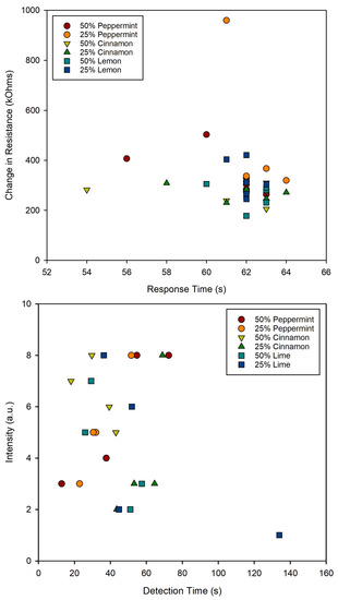 We then compared the results from the integrated VOC sensor with the human panel. In this application, the volunteers are behaving as the sensing/detection technology and typically this is considered the gold standard for odour detection. Here, we considered the response time and the intensity provided by VOC sensor and the human panel. For the VOC sensor, the change in sensor resistance was used for the magnitude, comparing the resistance before and after the chamber was filled with odour, and the time to reach 90% of its final value as the response time. For the human panel, the absolute intensity and the time to detection was used. Figure 11 shows the results of this comparison. As can be seen, the VOC sensor provides a relatively stable output, which only provides limited differentiation to the different odours, with peppermint generally producing the strongest result and lemon the weakest. The response time is likely to be defined by the pump, where the chamber takes longer to fill that the sensor to respond, thus giving almost identical response times. The samples also contained a high ethanol content, which may limit the sensor’s ability to further differentiate the odours. However, the human panel also shows limited capacity to differentiate odours based on response time and intensity. The response time had a window of around 40 s and variance in intensity across the scale. Interestingly, for peppermint, the longer the detection time, the stronger the perceived intensity, while with cinnamon and lime the opposite occurs, with the longer the time to recognition, the lower the intensity. The latter would be more expected as the odour would diffuse over time leading to a lower intensity. However, it indicates that these parameters are affected by how humans perceive odours and that sensitivity is different depending on the odour. An advantage of human sensing is that the odour detection threshold of ethanol is high, meaning that they are not affected as much by the higher ethanol content [20]. This shows the potential importance of smell training before the experiments and also issues that might arise with such systems in a consumer setting, where subjects would not normally have received training.