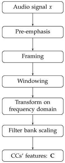 To define a classification model based on the representation of the voice signal, it is necessary to use techniques that extract important characteristics of the analyzed signal for the considered problem. This usually involves a feature extraction step that highlights patterns from inherent features in the raw signal. In the area of audio processing and analysis, it is common to use features extracted directly from the temporal version of the sound signal, the most used being those based on energy [74], entropy [75], ZCR [76], and energy Teager operator (ETO) [77]. However, for problems that require a higher level of detail in the representation of the signal, as is the case of the problem of detecting dysphonia in the user’s speech, it may be more appropriate to use a category of features capable of representing harmonic characteristics and associated sidebands to the signal and its spectral domain. Examples of its techniques include those based on the use of the cepstral features of the signal, such as the MFCC and the LPCC, which are the representations analyzed in depth in this work. These techniques involve a pre-emphasis step to compensate for high-frequency suppression, followed by steps of splitting and filtering the signal to represent it in the frequency domain through some specialized transformation, such as the fast Fourier transform (FFT). Finally, CCs are calculated using a filter bank scale. Figure 1 presents a general outline of the CC calculation process in sound signals.