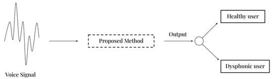 Solutions for dysphonia detection can act according to different methodologies. However, two more common methodologies involve the definition of a user recognition system: the one that counts with all the steps of a BAS, and the one that defines only the voice disorder check step. In this work, we adopt the second. That is, the proposed material is only responsible for answering whether a voice signal belongs to a healthy individual or if it was obtained from an affected one. Thus, our operation must be restricted to the solution of a binary classification problem composed of vectors that can be added to two different classes: the group of users with a healthy voice; and the group of users with voice dysphonia. A representation of the acting of the proposed material is schematized in Figure 2.