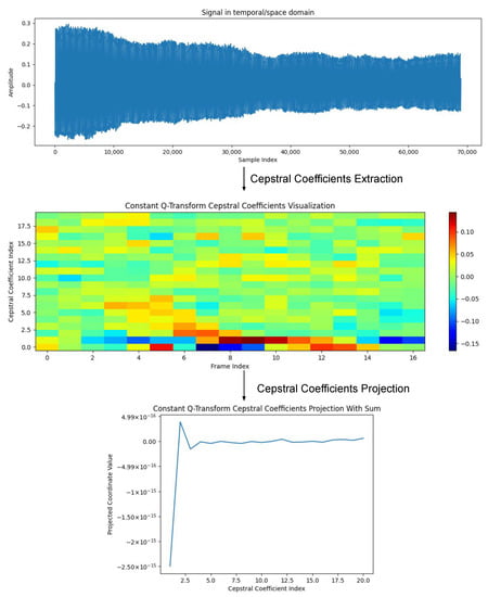 In Figure 3, we present an example of the projection process of a CC extracted from a voice signal x. In this case, the mapping function is the sum of the columns of the cepstral feature extracted by the constant Q cepstral coefficient (CQCC) [82] technique (), which is originally given in the form of a matrix , as in Equation (1).