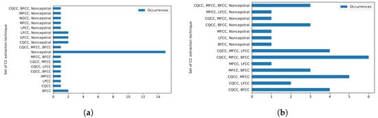 Representations obtained from the cepstral domain or computed from features known as cepstral coefficients of a voice signal were used to detect patterns [66], in particular the presence of pathologies [67], with MFCC [68] the most well-known technique in this category. The work of Godino-Llorente and Gómez-Vilda [69], for example, is one of the first advances that proposes the use of cepstral characteristics calculated from the MFCC and its first- and second-order derivatives, in the case of and , to detect the presence of voice disorders. Arias-Londono et al. [70] used the cepstral coefficients of an MFCC to train a Gaussian mixture model (GMM), and used information from the modulation spectrum of the signal to train a support vector machine (SVM) and be able to form an ensemble of classification and detection of voice disorder. Cordeiro et al. [71] analyzed the speech signal’s MFCC together with their spectral line frequencies and used these features to train three classifiers: a GMM, an SVM, and a discriminant analysis machine. In [72]’s work, the Mel-scale spectrogram and the chroma features were used together with the signal’s MFCC to train a deep neural network (DNN), which enabled the development of a framework capable of detecting the presence of cordectomy in speech with an accuracy of . In this sense, Lee [37] conducted a robust experimental analysis on HOS features together with cepstral features extracted from MFCC and LPCC to adjust a feedforward neural network (FNN) and a convolutional neural network (CNN). As an extension to the last work, Lee and Lee [73] added experiments considering data balancing techniques on the Saarbruecken voice database.
