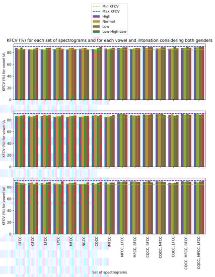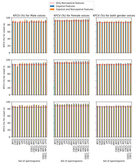 Associated with the voice, there is a clinical phenomenon known as dysphonia [18,19,20], which corresponds to changes in the voice of individuals caused by some disease that disturbs the human vocal tract. As an example, we can highlight very common diseases, such as colds and flu [21], and more complex diseases such as Parkinson’s [22,23] and Alzheimer’s [24]. Specifically, according to Hur et al. [25], nearly of the US adult population is affected by some form of dysphonia. In addition to all the physiological damage and the decrease in quality of life [26] that this phenomenon can cause, it is also known that dysphonia can compromise the performance of voice-based recognition systems. Rohlfing et al. [27], for example, found that the command recognition performance presented by Google Voice was reduced from to when individuals with voice dysphonia started to use the system, which corresponds to a reduction of more than in accuracy. To get around this adversity, automatic detection methods for voice dysphonia have been proposed in the literature [28], since the prior detection of dysphonia can be useful in the sense that the system makes use, for example, of specific routines for filtering to improve recognition of an affected speaker. Among such methods, the most common are those that make use of strategies based on machine learning [29,30] and analysis of handcrafted features [31,32], which are obtained from the voice signal, the most common in the subject being those defined by mappings and perturbations of the fundamental frequency () of the signal [33,34] and those based on cepstral coefficients (CCs) [35] such as Mel-frequency cepstral coefficients (MFCC) [36] and linear prediction cepstral coefficients (LPCC) [37], among others [38,39]. In most works that use CCs to detect voice dysphonia, only one cepstral technique is considered to compose the sound signal representation model, and there are few works in which more than one type of cepstral feature is used. Furthermore, CCs are originally defined by a matrix , with being the number of CCs and the number of temporal windows considered in the signal splitting, which must be calculated for each sample that we intend to represent, which can result in a high memory cost in the developed model. To get around this adversity, a commonly used strategy consists of projecting this matrix through some statistical mapping, such as sum or average on the frame axis. However, to the best of our knowledge, there is no work that demonstrates the efficiency of certain mappings on the CCs, especially when considered together, in the representation of a voice signal in the dysphonia detection problem.