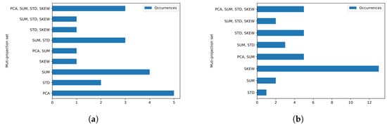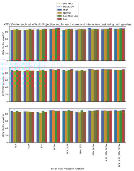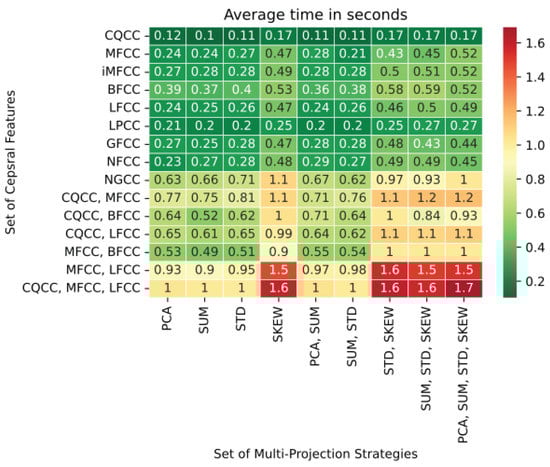 So, if we have a matrix of CC features generated by a technique from the signal x, as shown in Equation (1), and their first- and second-order differentials represented, respectively, by and . The definition of the cepstral features of x through the proposed multiprojection strategy, and with respect to the set and method , is expressed by the vector , defined in Equation (3):
