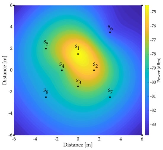 Example of a REM: Black dots indicate locations where the power measurements are taken using eight sensors. In this case, only a transmission source with dBm is considered.