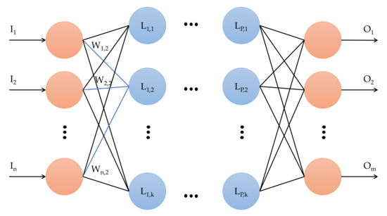 In this work, we used the multilayer perceptron (MLP), as shown in Figure 2. This type of artificial neural network consists of an input layer, one or more hidden layers, and one output layer. In the MLP, neurons in each layer are connected to neurons in the next layer, and they use an activation function to determine the neuron’s output. Information flows only in one direction, from the input to the output layers, passing through the hidden intermediate layers between the input and the output [36]. The general formula for calculating the output of a multilayer perceptron is given by [37]