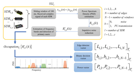 - Sliding window of 100 ms. In this block, the complex signal from each SDR in the time domain was received and updated every 100 ms from the radio environment of the i-th SU integrated by z different SDR devices;
