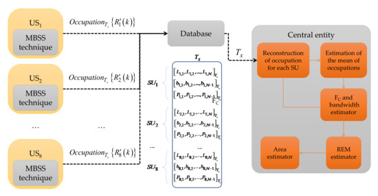 The edge detector, binary decision, and power vectors were stored in the database. It is important to note that the information stored in the database stemming from each SU was not necessarily similar; the lengths of the vectors were different for each SU. Indeed, each SU observed a different behavior of the radioelectric spectrum, because they were placed randomly in different geographic coordinates. To account for this discrepancy, all vectors were labeled with the exact sensing time Tx (see Table 2), i.e., synchronized. Information was uploaded to a server, saving only enough relevant data (three different vectors for each SU) in the database to permit fast storage and extraction, taking advantage of SUs’ hardware performing the MBSS technique locally. Indeed, the three uploaded vectors for each SU take up very little memory space. In the best case (without even a PU in the sensed spectrum), the edge detection vector had a length of two, while the binary decision vector and the power vector had a length of one. In the worst case, when the SNR had a low value (close to 0 dB), multiple windowing appeared due to noise, thus increasing the vectors’ lengths. However, regardless of the size of the three vectors, the information was compact and facilitated the reconstruction of the spectrum signal occupation, including the average power for each reconstructed window.