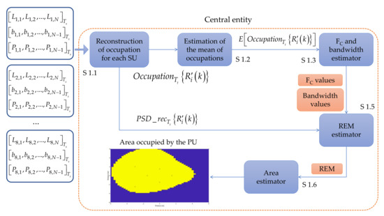 - The collection of information obtained by SUs. For this, each SU locally processes the sensed data to be sent to a central entity, including the occupancy of the observed spectrum in its geographic location and the frequency band edges and estimated power vectors;