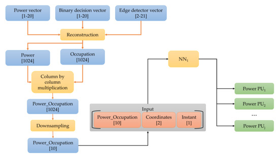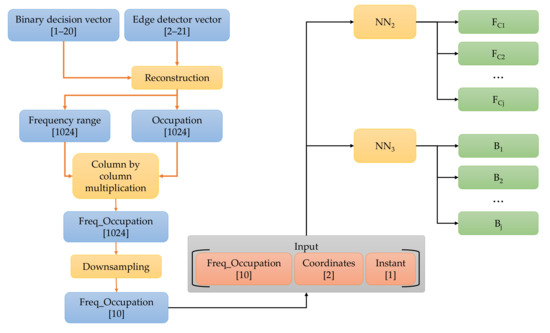 Figure 9 shows the construction of the vector . Here, the occupancy and the frequency bands vectors corresponding to the frequency interval perceived by the corresponding SU were reconstructed. This vector was also multiplied column by column with the occupation vector, resulting in the vector being 1024 samples in length. This latter vector was assigned zeros where it corresponded to noise and nonzero values for the samples that corresponded to one or several PU transmissions. Again, downsampling was applied to reduce this vector to only 10 samples and join it with the coordinates of the SUs and the time corresponding to the sensing period. This concatenation drives the input of and .