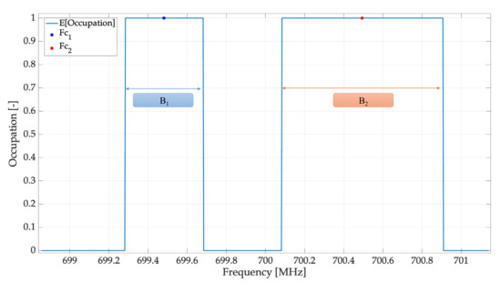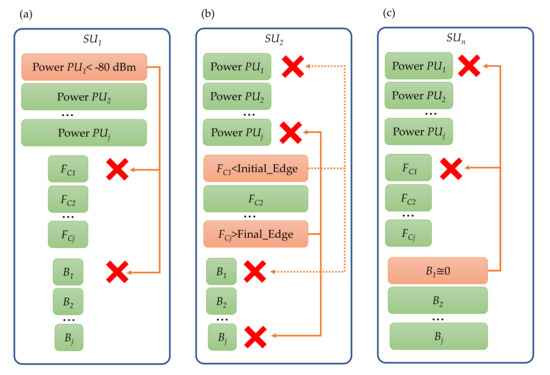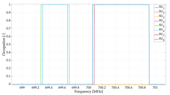 - Estimation of frequency bands and detection of primary users. In this module, the MBSS technique based on SampEn, K-means algorithm [47] (permitting to optimize specific detection parameters), and discrete wavelets was applied to each SU’s analyzed wideband spectrum in order to obtain the spectrum occupation given by . This result included three vectors which contained binary values indicating occupied (“1”) and empty (“0”) bands. The second vector was and contained the corresponding computed boundaries for each detected band, and the third was , which contained the power for each detected band.