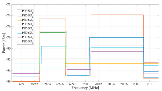 The output corresponds to the power of each PU detected by each SU. When the PU power value was less than −80 dBm, it was interpreted as no transmission, corresponding to noise. The output of resulted in the carrier on which a possible PU was located. Finally, the output delivered the transmission bandwidths corresponding to each detected PU in the analyzed spectrum.