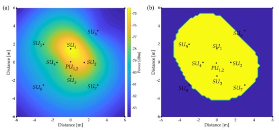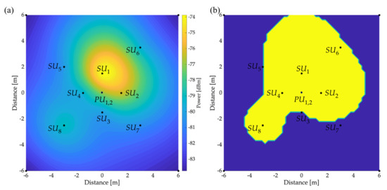 | Step 1.6 | dBm is used to classify the area estimated by the REMs that was chosen in [41] for a wireless environment. That is, regions in the REM that are above this threshold correspond to the active area of detected PUs. |