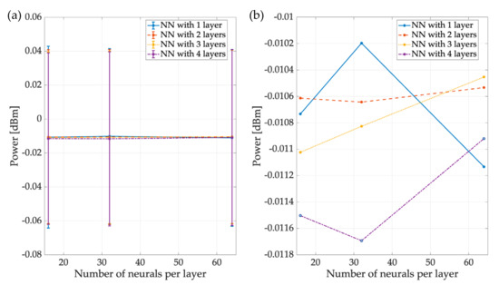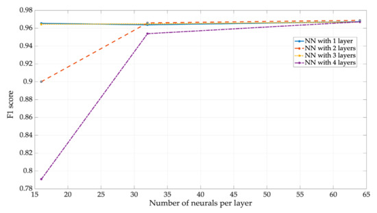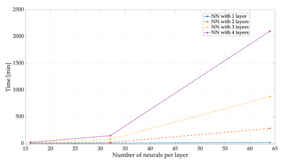 After that, the power- and occupation-reconstructed vectors were multiplied column by column, resulting in the vector of 1024 samples. In this last vector, locations with estimated noise had a value of 0, and those with the possible transmission of one or several PUs had a value corresponding to the average power of detected windows. A downsampling of the vector was performed to reduce it to only 10 samples and to combine it with the coordinates of the SUs (to which the analyzed vectors correspond) and the time at which the signal was sensed, thus finally integrating the input vector for . It should be noted that the time parameter is extremely important since the spectrum behaves differently over time.