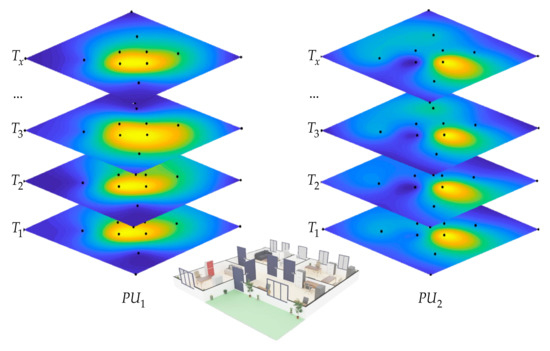 where is the estimated value of the variable at the unknown point , is the known value of the variable at the i-th point , is the Euclidean distance between the unknown point and the point , is a smoothing parameter controlling the influence of the known points over the estimated values, and is the weight assigned to each known point in order to account for the uncertainty in the known data. In practice, a value of or is usually used. The estimated values of result in a mesh of unknown points. However, this method has limitations, such as a tendency to smooth out data variability and produce an inaccurate estimate in areas with few known points. In this work, represents the power spectral density (PSD) in the different points around the sensed area.