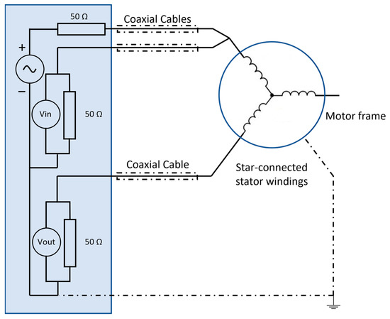 SFRA has been successfully used to perform diagnostics on the windings of electric machines during the production process [46,47]. An electric machine can be considered a complex electrical network of capacitances, inductances, and resistors. As shown in Figure 1, the SFRA instrument injects a sinusoidal excitation voltage (the typical amplitude is 10 Vpp) with a continuously increasing frequency into one end of the transformer winding and measures the signal returning from the other end. This test is conducted with the machine disconnected from the power line. More details are reported in another study [46].