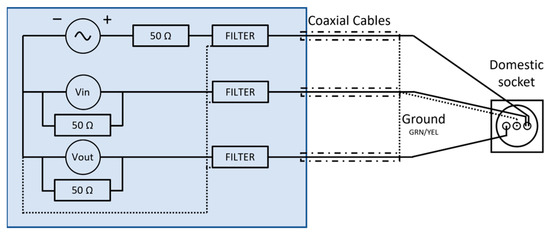 The signal generator is coupled to the network by means of a band-pass filter that allows only the passage of the test signal. The two input channels of the measurement circuit are also decoupled from the power supply by two other band-pass filters. The filters block both the fundamental frequency (50 Hz) and the harmonic components (up to 2 kHz) [48].
