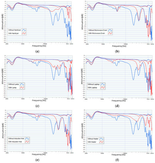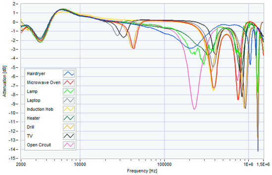Figure 4 shows the frequency response of these appliances when powered individually. The measurements were conducted in 24 different power supply scenarios, as summarized in Table 1. It is important to note that Scenario 1 represents the case in which none of the appliances was powered (condition indicated with “Open Circuit” in Figure 1). Scenarios 2 to 9 represent the single power supply conditions of household appliances. Scenarios 10 to 24 represent the simultaneous power conditions.