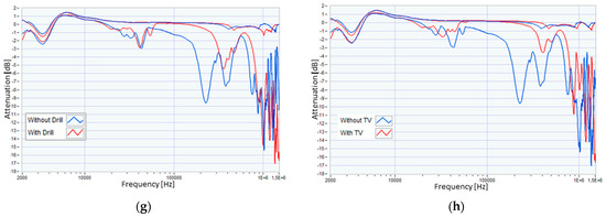 Envelopes of the traces obtained in the presence and absence of the: (a) hairdryer, (b) microwave oven, (c) lamp, (d) laptop, (e) induction hob, (f) heater, (g) drill, and (h) TV.