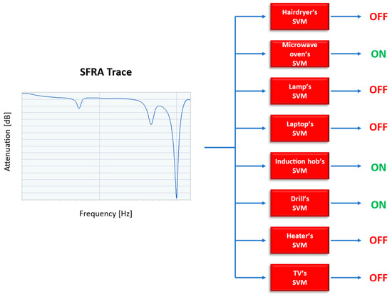 The proposed system is based on a machine-learning algorithm, the Support Vector Machine (SVM), which is capable of determining the status of individual household appliances starting from the measurement obtained by the SFRA system. It was installed on a home test system and acquired and processed the data locally.