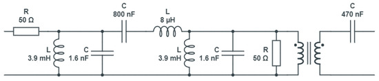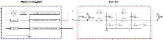 Specifically, the simulation was oriented to analyze the effects produced by the test signal on commercial EMI filters that could be connected (to other devices) in proximity to the system being tested. The analysis was extended to the entire range of frequencies involved; as a reference, a commercial EMI filter family was considered [61] for standard use in commercial and residential apparatuses for AC currents up to 16 Arms in single-phase systems.