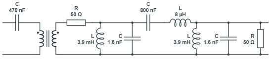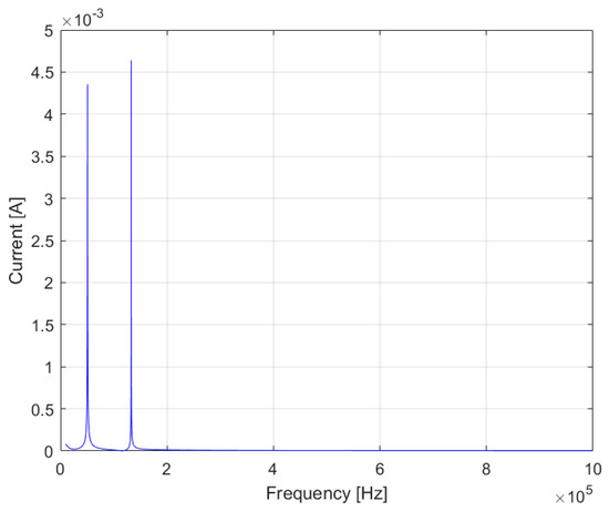 The system’s response was evaluated by varying the frequency in the range in which the proposed system operates in the final configuration (10 kHz–1 MHz). The frequency response of the current entering the EMI filter was evaluated. Several simulations were carried out by varying the RLC parameters of the EMI filter. The current was found to be harmless across the entire spectrum. As an example, Figure 15 shows the input current response obtained with the RLC parameters reported in Figure 16. The spectrum shows two resonance peaks and a maximum current draw of 4.64 mA.