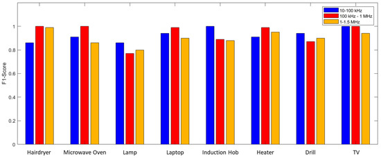 To support an objective evaluation, Figure 5 shows the lower and upper envelopes of the traces obtained in the presence and absence of each of the eight considered appliances, obtained following the measurements performed for the different scenarios. Measurements were performed for each of the 24 scenarios reported in Table 1, thus obtaining 24 SFRA traces. For each envelope (related to each appliance), the traces were divided into two groups according to the presence or absence of the appliance in the power supply scenario. The envelopes were then obtained by considering the maximum and minimum values of each of the two groups for each frequency bin. From these envelopes, it is immediately evident that the contribution of the low-frequency measurement (2–10 kHz) is not influenced by the different load configurations; therefore, in the rest of the work, we will only refer to the other three sub-bands.