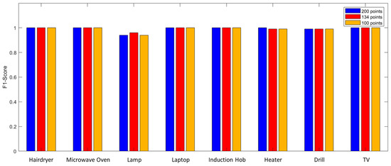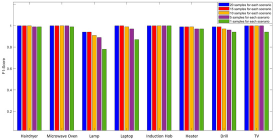 Lower performance was found in the detection of the Lamp, Laptop, and Drill. In the case of the Lamp, this is due to the insignificance of its related load compared to the overall network, while in the case of the Laptop and Drill, it is due to the extreme variability of their working conditions. However, F1-Score values of 0.78, 0.87, and 0.94, respectively, can be considered largely satisfactory for a trained system with such a small number of samples.
