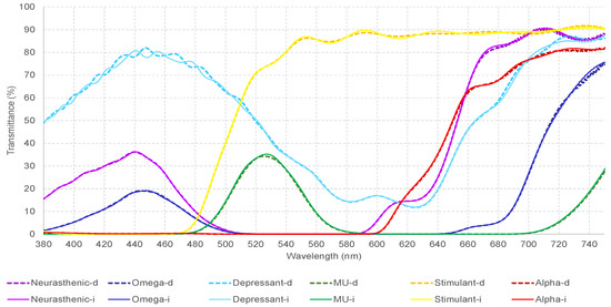 Step four: VEPs at baseline and under the effect of the six monochromatic filters were recorded at Santo Tomas Hospital by Dr. Enoé Cruz-Martínez, specialist in neurophysiology.These data were necessary to understand the functionality of the visual system and its best performance. The monochromatic filters used in this study correspond to the following colors: Alpha = red, Stimulant = yellow, Mu = green, Depressant = light blue, Omega = dark blue, and Neurasthenic = violet. Filters’ characterization (wavelength and transmittance) was performed at the National Center of Metrology. All tests were performed by the same examiner, Dr. Danjela Ibrahimi, specialist in vision and child development. The above-mentioned clinical evaluation can be found in the Appendix A. Additionally, detailed information about the visual efficacy exam can be found in [30]. - (ii)
