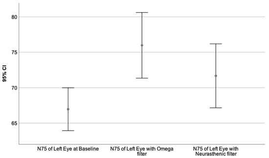 Illustrates the mean value of the N75 latency of the left eye for 95% CI, at baseline, and under the effect of the Omega and Neurasthenic filter. The X-axis shows the monochromatic filters that had a statistically significant impact on the baseline value, while the Y-axis presents the obtained values expressed in milliseconds. As can be seen by the graphics, the Omega filter had the biggest effect on the N75 latency of the left eye, by significantly incrementing its value.