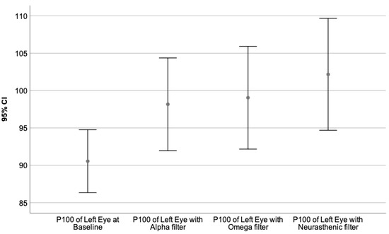 The P100 latency of the left eye at baseline compared to its value obtained with the Alpha, Omega and Neurasthenic filter is presented by Figure 4.