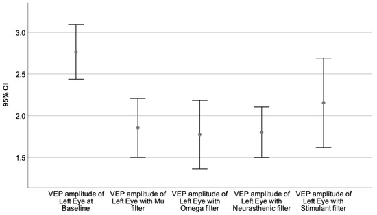 Illustrates the mean value of the VEP amplitude of the left eye for 95% CI, at baseline, and under the effect of the Mu, Omega, Neurasthenic, and Stimulant filters. The X-axis shows the monochromatic filters that had a statistically significant impact on the baseline value, while the Y-axis presents the obtained values expressed in microvolts. As can be seen from the graphics, the effect of Omega and Neurasthenic filters is almost identical. They significantly diminished the VEP amplitude when compared to its baseline value.