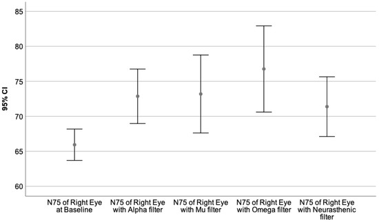 Figure 6 presents the results of the N75 latency of the right eye at baseline compared to its value obtained with Alpha, Mu, Omega, and Neurasthenic filters.