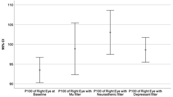 The P100 latency of the right eye at baseline compared to its value obtained through Mu, Neurasthenic, and Depressant filters, is shown in Figure 7.
