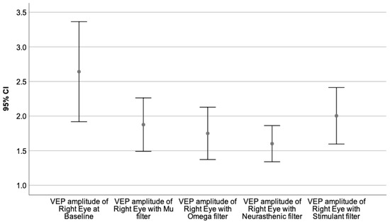 Illustrates the mean values of the VEP amplitude of the right eye for 95% CI, at baseline, and under the effect of Mu, Omega, Neurasthenic, and Stimulant filters. The X-axis shows the monochromatic filters that had a statistically significant impact on the baseline value, while the Y-axis presents the obtained values expressed in microvolts. As can be seen from the graphics, the Neurasthenic filter had the biggest effect on the VEP amplitude of the right eye, by significantly diminishing its value.