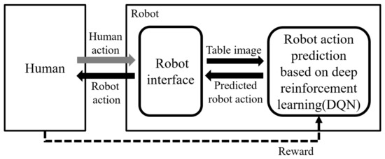 With recent technological advancements, various machines and robots with artificial intelligence (AI) have emerged to work on behalf of people, ranging from washing machines to robot cleaners. Reinforcement learning (RL) [1,2,3,4,5], an artificial intelligence technique, is commonly applied in robot action learning. Several prior studies on RL have been conducted to develop behavior-imitation robots [6,7] and robot navigation [8,9]. As AI robots undertake human tasks, individuals have more time for leisure and self-development; as a result, many people require robots to work instead of humans.