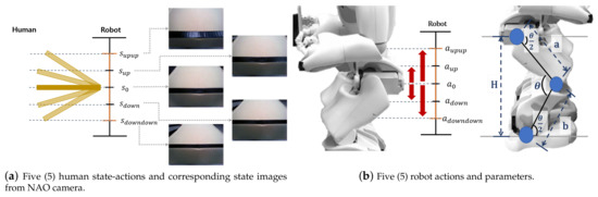 Figure 3b shows the robot behavior and parameters for its calculation. As shown in the image on the right-hand side of Figure 3b, there are five robot actions, , and , which are divided according to the degree to which the robot’s hip goes up or down, as in the state. When manipulating a robot arm, the complexity of the problem increases as it requires modeling various balance states corresponding to different robot arm positions. To solve this problem, a robot was constructed that restricts its arm movements and achieves table balancing solely through the use of its legs. In addition, we only consider the slope, excluding table movement, and assume that the slope of the surface held by the robot or person with both arms is the same. As shown in Figure 3b, the hip height (H) is calculated using the current leg angle to classify the behavior according to the robot’s hip position. The height to be operated is added, and the new robot leg angle is calculated and driven. The height of the hip is calculated using the cosine, which is Equation (1).
