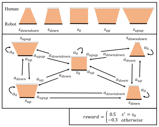 Figure 4 depicts a reward model for robot learning based on human action, with each state showing the probable robot actions to transit to the next state. If the table is balanced, a positive reward () is given; otherwise, a negative reward () is given.