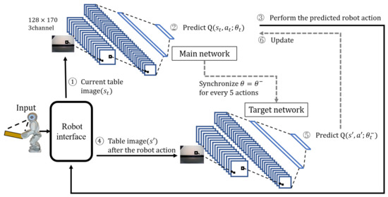 Figure 5 depicts the learning process of DQN’s robot action prediction for the proposed table-balancing cooperative robot. First, the robot interface photographs the current table image and sends it to the DQN’s main network (①). The main network predicts the Q-function for the robot action using the table image (②) and determines the robot action using Equation (4)’s –greedy policy.