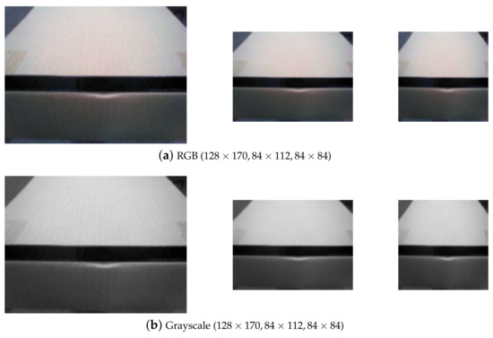An experiment was conducted to find an image optimized for robot learning, and the image used in the comparative experiment is shown in Figure 6, with the RGB image (original) and grayscale images adjusted to 128 × 170, 84 × 112, and 84 × 84.