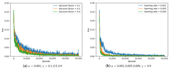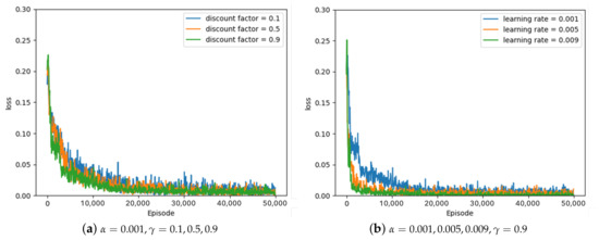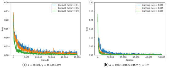 Some of the experimental results from the optimal parameter experiment are depicted in Figure 7, Figure 8 and Figure 9. Figure 7, Figure 8 and Figure 9 represent the average loss (Equation (5)) per 100 episodes. Figure 7 depicts the results of the greedy policy, Figure 8 depicts the results of the 10–greedy policy, and Figure 9 depicts the results of the 20–greedy policy. First of all, Figure 7a demonstrates a loss graph with a learning rate of 0.001 and a discount factor of 0.1 (blue line), 0.5 (orange line), and 0.9 (green line). The decreasing loss indicates that the policy is converging through learning, and when the loss converges, it is analyzed to determine the policy. Figure 7a shows that when the discount factor is 0.9, the loss convergence is the fastest, and the loss convergence appears rapidly as the discount factor increases. The target in Equation (5) depends on the discount factor, which affects the amount of the next-state information in the current state. As the discount factor increases and amount of the next-state information decreases, the convergence rate improves. As illustrated in Figure 7b, the convergence rate is fastest when the learning rate is 0.009, and the convergence rate increases as the amount of updates increases in proportion to the learning rate. According to the greedy policy parameters, the same pattern can be seen in Figure 8 and Figure 9, showing the 10–greedy policy and 20–greedy policy, respectively.