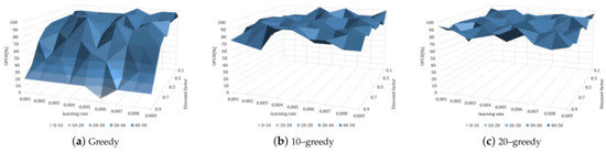 Parameter-search experiments for the optimal learning rate and discount factor were conducted for the proposed method, that is, the greedy policy, the 10–greedy policy, and the 20–greedy policy. Training DQN with this proposed method means the greedy policy will always select the actions with the highest Q-value, while the 10–greedy policy and the 20–greedy policy select random actions with 10% and 20% probability, respectively.