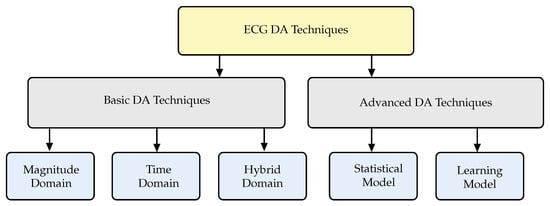 To the best of our knowledge, no comprehensive review of DA techniques of AI applications on ECG signals has been carried out yet. Since its practical significance and potential for the development of ECG classification models, we considered the DA techniques of the AI methods applied in ECG classification worth a review. In this study, papers were systematically reviewed and their characteristics were highlighted. By reviewing all methods, a taxonomy of the ECG DA methods is proposed for the first time and illustrated in Figure 1. The taxonomy mainly breaks down into two categories: basic DA techniques and advanced DA techniques. The basic DA techniques include all methods based on random and non-random transformations of the ECG signal in the magnitude domain, time domain, and time–magnitude domain. Conversely, advanced DA techniques include alternative methods to model the data such as, for example, statistical models and learning-based models. Advanced DA techniques follow the distributions of features present in the dataset to produce novel pattern combinations. Many statistical models, such as the Gaussian mixture model (GMM) and Markov chain (MC) models have been proposed for generating new samples [11,12,13]. Learning-based models such as variational autoencoder (VAE) [14] and generative adversarial networks (GANs) [15], are relatively new models developed recently for the generation of ECGs. The paper is structured as follows: