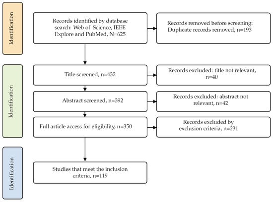 Implementing the search query and inclusion/exclusion criteria, we initially obtained a list with 625 articles; we then excluded 193 duplicates using reference manager software or manual review. After screening the remaining 432 papers based on their titles and abstracts, 350 papers were selected for full-text evaluation according to our inclusion/exclusion criteria. The inclusion and exclusion criteria are presented in Table 2. Ultimately, 119 papers met the criteria and were kept for further analysis.
