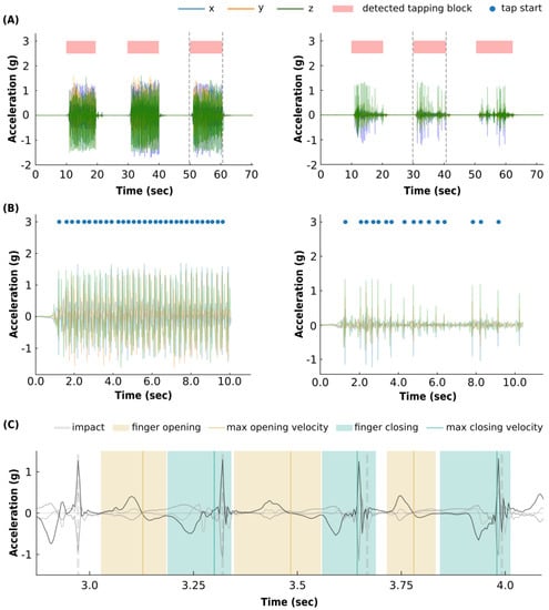 To calculate clinically relevant kinematic features per tap, the algorithm detects all single tapping movements within the aforementioned tapping block. We define a tapping movement here as the period between two consecutive closings of the index finger and thumb. The closing of the index finger on the thumb (i.e., the moment that the index finger touches the thumb) causes a sharp positive peak in the accelerometer trace due to the relatively large deacceleration of downwards movement, described as the contact force by Okuno et al. [36]. We will refer to this moment as the ‘impact’ moment, and the model uses this characteristic acc-peak of the impact to identify the moments where the index finger touches the thumb and to define the ending of one tap and the beginning of the next tap. To find the impact moments, the algorithm first finds all peaks in the SVM-signal exceeding a threshold (i.e., 20th percentile of the maximum (max) of the SVM signal). Second, the model excludes peaks where the first differential of the SVM signal did not exceed a certain threshold (i.e., ±20th percentile of the max or the minimum (min) of the differential signal, respectively). Finally, probable tapping peaks were required to be at least 166 ms apart from one another. The function plots all detected impact moments and the acc-trace per block for visual inspection (for visualization, see Figure 1).