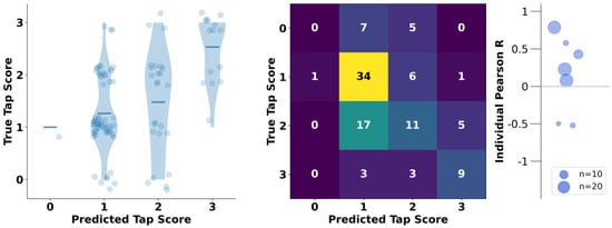 The holdout validation analysis of predicting expert-rated UPDRS Part III Item 3.4 scores from accelerometer-based kinematic features showed relatively good predictive performance, significantly better than chance level (i.e., 25%, see Methods 2.5), with a mean tapping score error of 0.56 (sd: 0.65, p < 0.001) and an ICC of 0.62 (p < 0.001) (see Figure 2, left panel) [47]. The true and predicted scores correlated moderately (Pearson’s r = 0.46, p < 0.001). The final selected model obtained features over the first 15 taps detected. For full summaries of model performance for the holdout dataset based on partial or total numbers of detected taps (i.e., results based on first 15 taps vs. all taps), see Table S2.