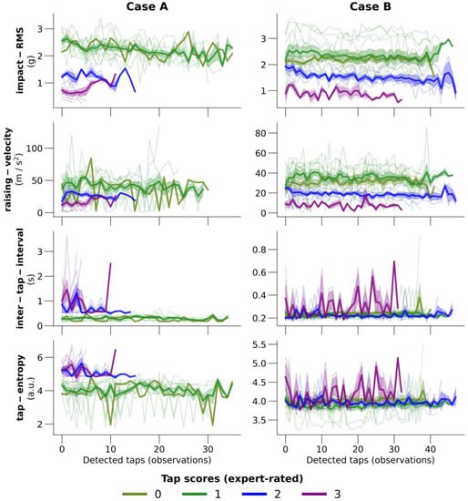 As an additional output, ReTap provides all extracted kinematic features per detected tapping block from preprocessed accelerometer traces. Figure 3 shows the course of four single-tap features in two exemplary subjects. It shows the differences in feature-course between tapping blocks with different expert-rated, true scores. For this example, we display data for four single-tap kinematic features that were relevant for the RF classification (impact-RMS, finger raising-velocity, ITI, and entropy per tap, see Figure S1). Expected differences in impact-RMS and raising-velocity are visible between the tapping scores, and in some of the cases, we observe a decrement over time characteristic for PD. Both the tap-entropy and the ITI were higher and more variable in tapping blocks, with worse tapping performance as expected.
