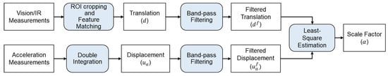 In this study, an acceleration-aided algorithm [] was adopted to automatically estimate the scale factors required for image-based displacement estimation. As shown in Figure 2, translation was first estimated from the collected short-term vision/IR images after ROI cropping and feature matching. In this study, the speeded-up robust features (SURF) [] algorithm was used owing to its high accuracy and low computational cost. Subsequently, a bandpass filter was applied to and the displacement was estimated from the double integration of the acceleration measurement. The lower cutoff frequency of the filter was set to be sufficiently high to remove the low-frequency drift in , and the upper cutoff frequency was set to 1/10 of the vision and IR camera sampling rate []. Finally, the scale factor was estimated as the ratio of filtered translation and filtered displacement using a least-squares estimation (LSE) algorithm. Before applying the LSE algorithm, was down-sampled to match the sampling rate with .