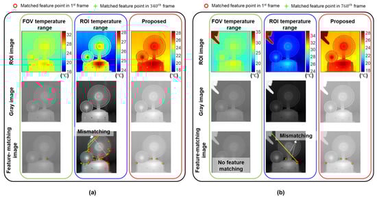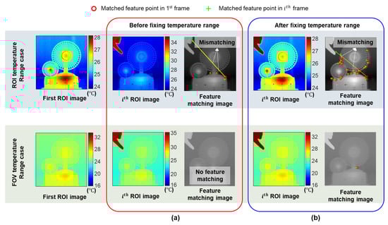 Example of region of interest (ROI) feature-matching results with heat source: (a) before fixing temperature range and (b) after fixing temperature range.